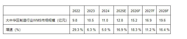 表1:2022~2028年大中華區(qū)制造行業(yè)WMS市場規(guī)模及增速